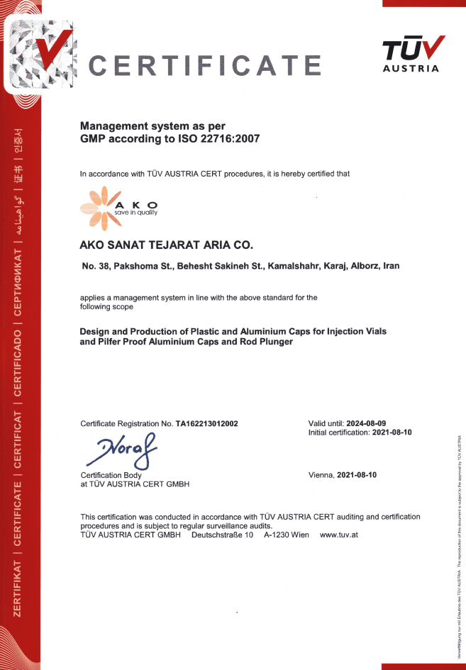 Ako Sanat Tejarat Arya commenced its operations approximately 10 years ago in the field of pharmaceutical packaging supplies. Since 2014, the company has expanded its focus to deliver innovative and high-quality services in the production of specialized pharmaceutical components and supplies. As a leading manufacturer of pharmaceutical supplies, the company specializes in producing pharmaceutical packaging equipment, particularly injectable vial caps. Ako Sanat offers products such as Flip-Off Caps, Tear-Off Caps, and Combi-Seal Caps for prefilled syringes.